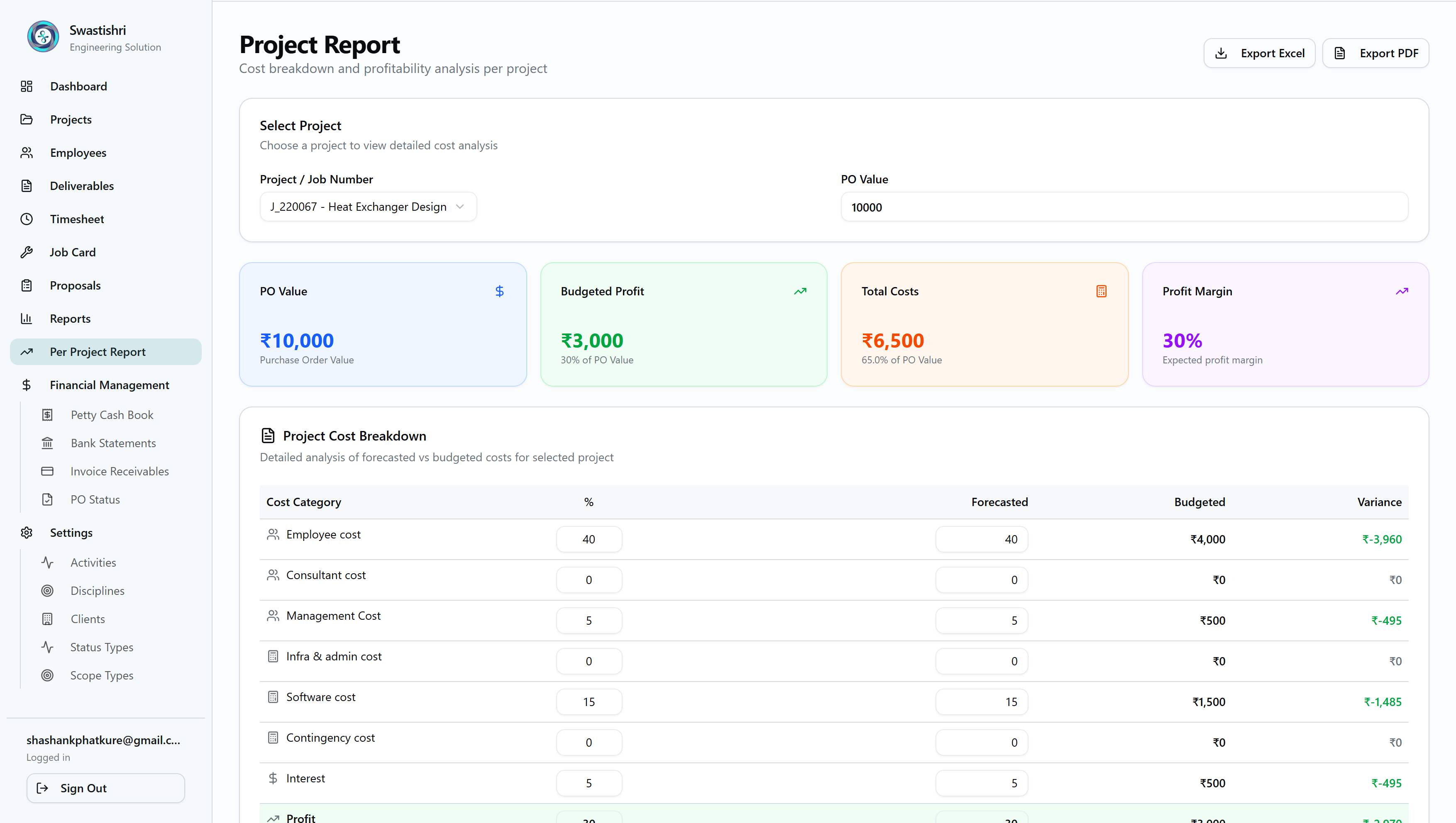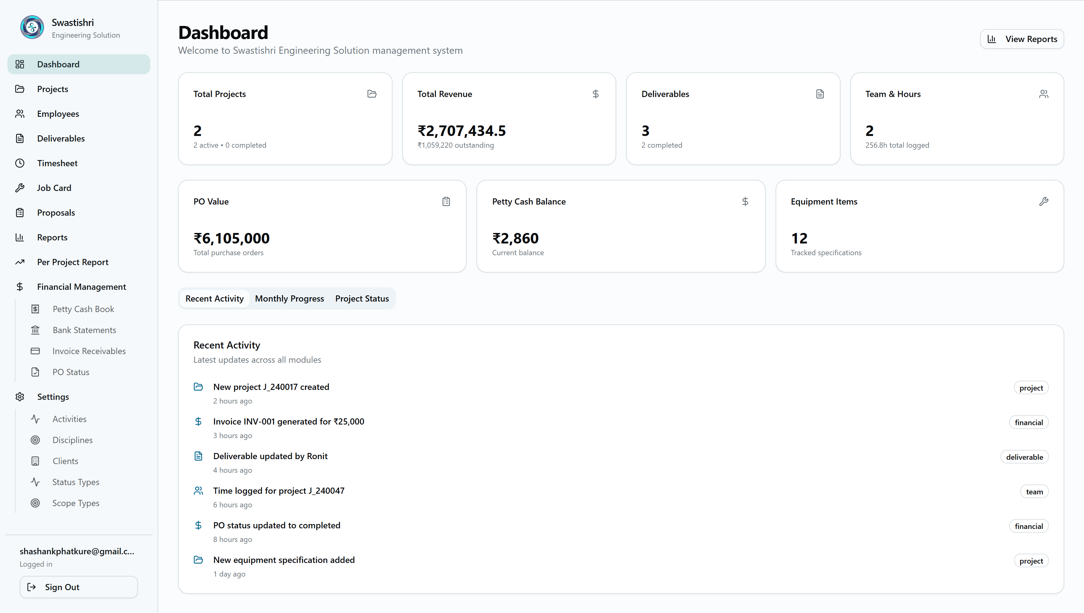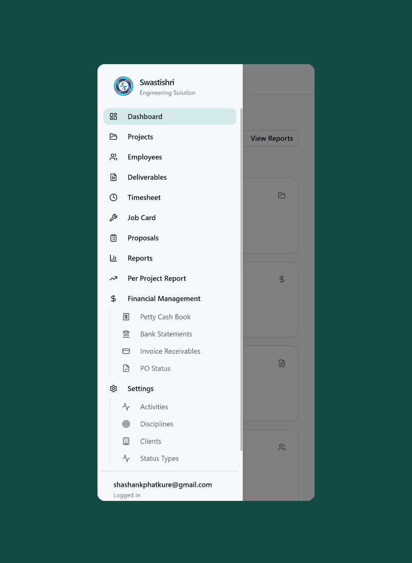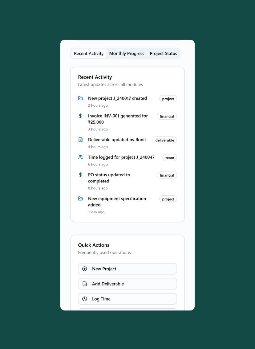 Swastishri's operations team was bottlenecked by manual project tracking and resource allocation processes. Every project update required multiple spreadsheets and phone calls, slowing down decision-making pipelines. This limited the firm's ability to scale operations efficiently and respond quickly to client requirements. Moreover, the engineering team was stretched thin managing administrative tasks that prevented them from focusing on core technical work.